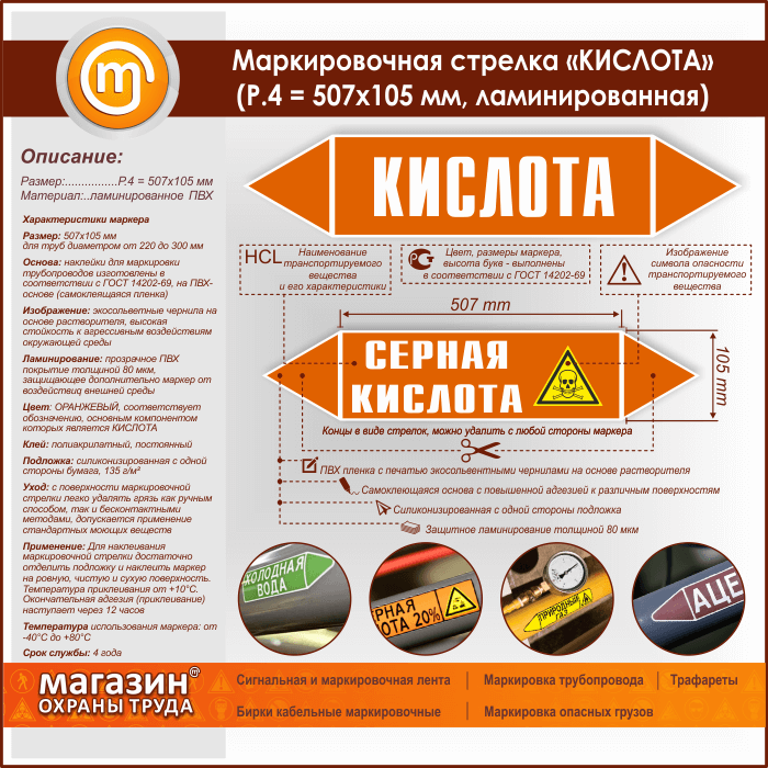 Маркировочная стрелка «КИСЛОТА» (P.4 = 507х105 мм, самоклеящаяся плёнка с ламинированием) в Симферополе купить